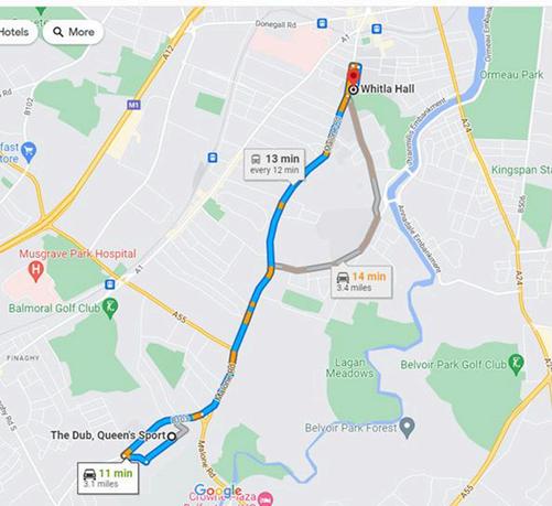 Campus parking is unavailable, and surrounding area parking is limited during term time. A free shuttle bus runs between the main campus and designated parking at Queen’s Playing Fields (The Dub) , Malone Sports Facilities, Dub Lane, Belfast BT9 5NB (as shown on the map).