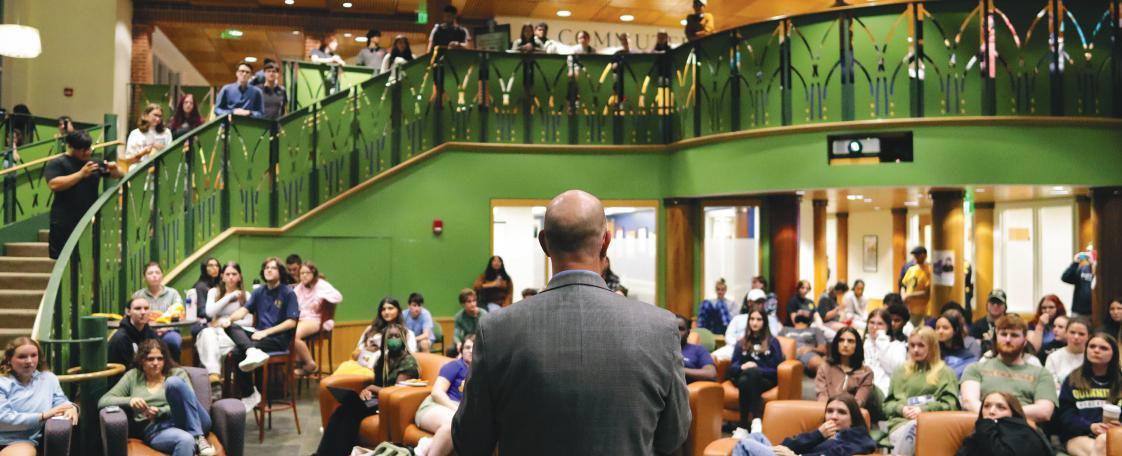 McLean, professor of political science, gives a speech to inform out of state students about their voting process.