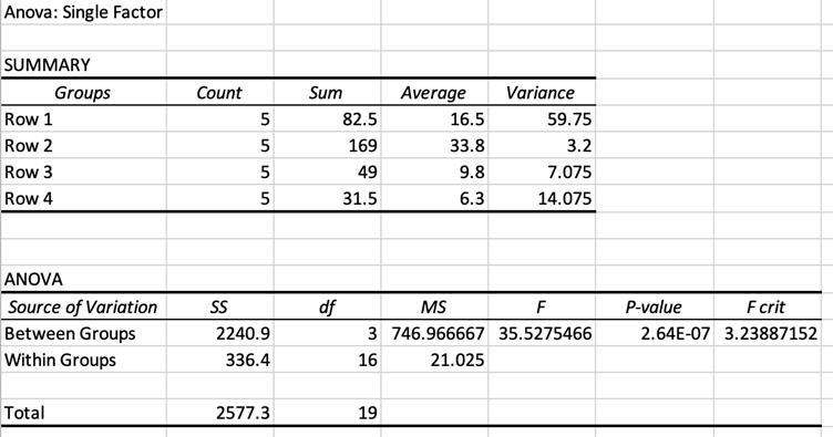 Figure 13. A one-way ANOVA statistical test was conducted on this data. The p value for this group of data was 0.000000264, which is <.05, therefore the results were statistically significant and the results were not due to random chance. This statistical test was utilised as the investigation met the assumption criteria. The assumptions for this test were as follows: the data was quantitative, the data obtained was independent of each other and randomly sampled, the variation in each group was similar, means were calculated for each group, replicates were conducted and not repeats, and falsifiability could occur through a null and alternate hypothesis.