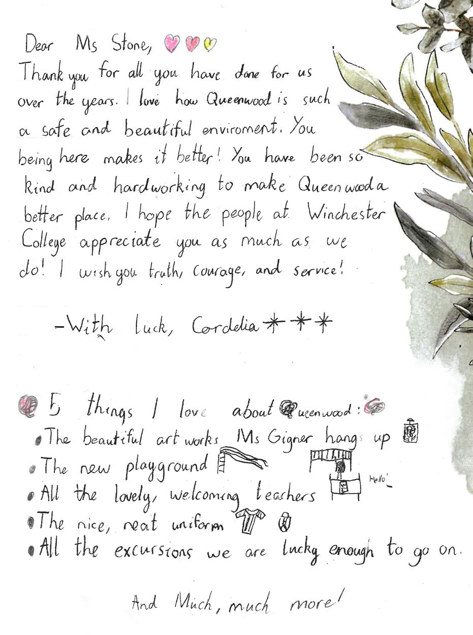 Thank you so much for sending us the QNews in which appeared the excellent article you wrote on Fiona and my mother’s connection with Queenwood. My wife and I were most impressed with the article and we have proudly received a number of phone calls from Fiona’s friends and “old girls” from our era.