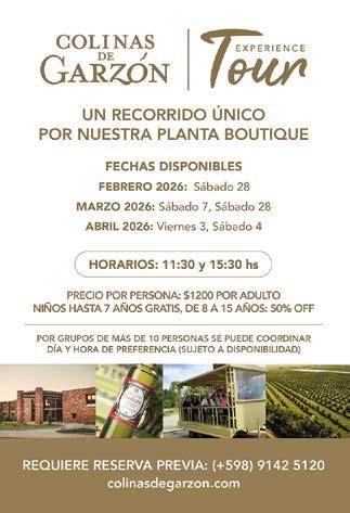 Colinas de Garzón Tour Experience, un recorrido único por su planta boutique, 11.30 y 15.30 h. Con reserva previa al +598 9142 5120. Adultos $ 1.200, de 8 a 15 años 50% off, niños hasta 7 años gratis. Colinasdegarzon.com