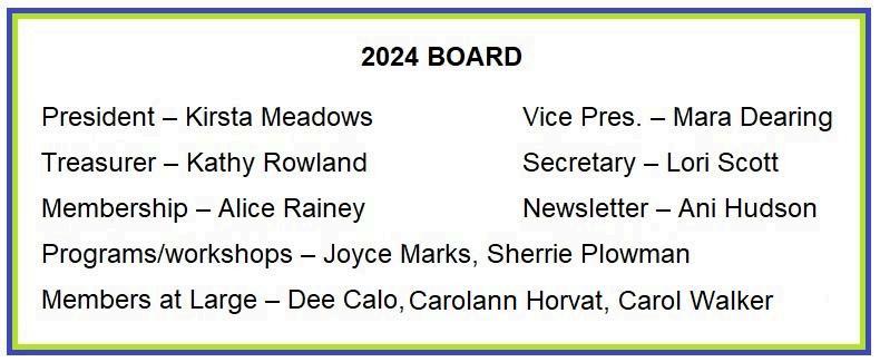 To continue to offer these wonderful workshops we encourage you to participate. We made sure to offer a variety of choices so everyone is sure to find something of interest. Please take a look at the offerings and make sure you sign up for one or more of these fantasticevents. Be prepared with Cash, Check, or Venmo at our June meeting to Sign up.
