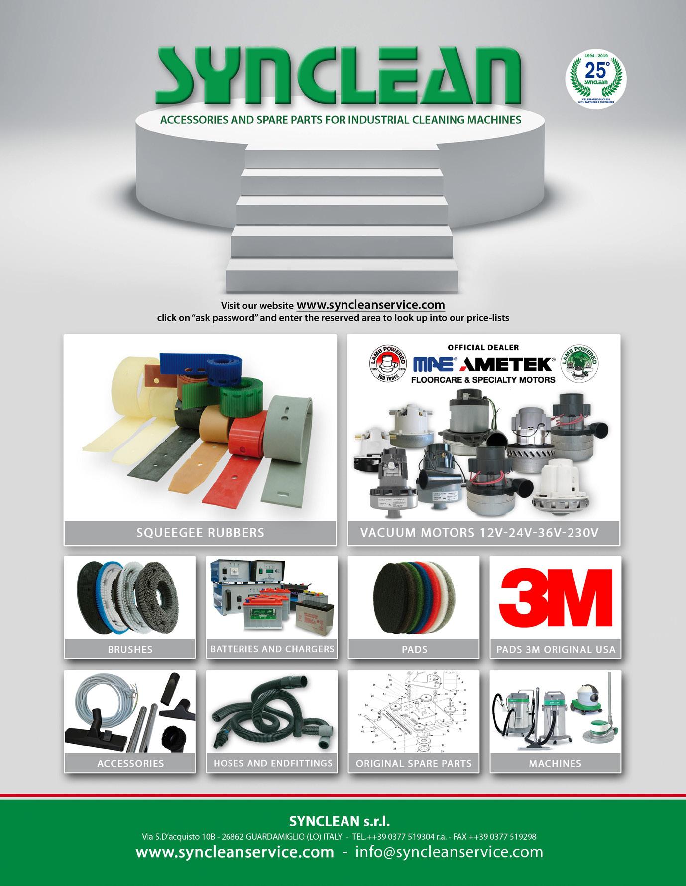 It has been over 25 years since Synclean had the idea of creating a database of accessories and spares for industrial cleaning machines. Modern and dynamic company but with a high level experience and specific know-how in the world of industrial cleaning machines, Synclean offers a wide choice of suction motors, squeegee rubbers, brushes, accessories and consumables that satisfy every request.