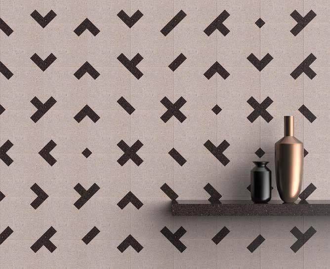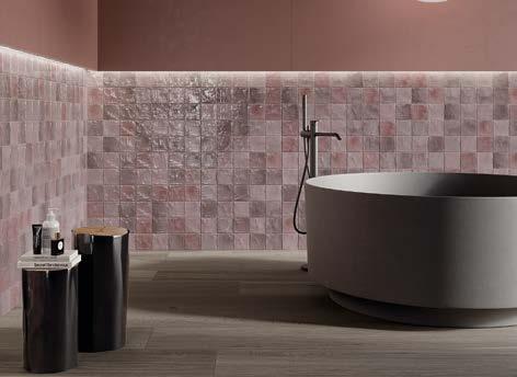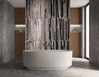 ● COLLEZIONI M+. Sul pavimento collezione Primal, progetto LO STUDIO + Massimo Nadalini, sulle pareti Rework Crack, anch’essa di LO STUDIO + Massimo Nadalini, e Rework XXL, di Marialaura Irvine