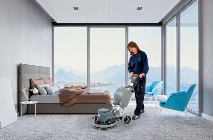 sta particolare gamma? “I privilegi della tecnologia orbitale, rispetto a quella tradizionale”, spiega Giampaolo Ruffo, “si possono riassumere nella facilità di utilizzo, nel risparmio di tempo, di prodotti e un minor consumo di energia elettrica. Per facilità di utilizzo intendiamo che qualsiasi operatore è in grado di usare una orbitale TMB senza correre rischi personali, né rappresentare un rischio per cose o persone. Contrariamente alle monospazzole tradizionali, la tecnologia orbitale non necessita di particolare forza fisica per utilizzare la macchina. Ciò comporta, oltre all’ovvio vantaggio di ridurre il training del 95%, la possibilità di impiegare un ampio numero di accessori per applicazioni molto diverse. Il movimento orbitale TMB non risente delle condizioni di attrito generate dai diversi accessori e permette a chiunque di effettuare applicazioni che con una monospazzola tradizionale hanno bisogno di personale con esperienza. Infine, il consumo di energia elettrica è inferiore del 60% rispetto al modello tradizionale e rimane pressoché costante nelle diverse applicazioni”.