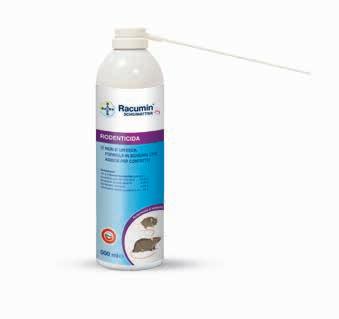 e Bitrex come agente amaricante, sostanza dal sapore molto amaro. Il prodotto è disponibile in bombola aerosol da 500 ml con cannuccia: Racumin SchiumAttiva si presenta come una schiuma di colore blu che si può applicare in fori, cunicoli e in tutti i punti di passaggio utilizzati da topi e ratti. In corrispondenza dei percorsi e dei passaggi individuati, applicare Racumin SchiumAttiva in modo da non chiudere comple tamente il passaggio, lasciando un po’ di “luce” visibile in modo che i roditori continuino a passarvi. I primi effetti sulla popolazione dei roditori inizieranno a vedersi dopo 3-5 giorni dall’applicazione.