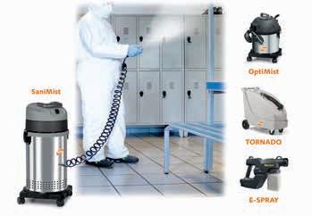 SaniMist e OptiMist, le versioni più piccole con l’involucro in inox, combinano la stessa performance e rendimento in due format più compatti e maneggevoli. E-Spray, Sanificatore a batteria al litio con pistola elettrostatica, fornisce una carica elettrostatica alla soluzione in uscita dall’ugello, che viene attratta dalle superficie Dà una copertura uniforme in minore tempo anche sulle superficie poco raggiungibili, con la convenienza e portabilità di una macchina senza cavo Tutte le macchine sopracitate sono compatibili e sicuri per l’uso con una vasta gamma di soluzioni, comprese soluzioni di perossido d’idrogeno oppure ammonio quaternario o soluzioni di cloro