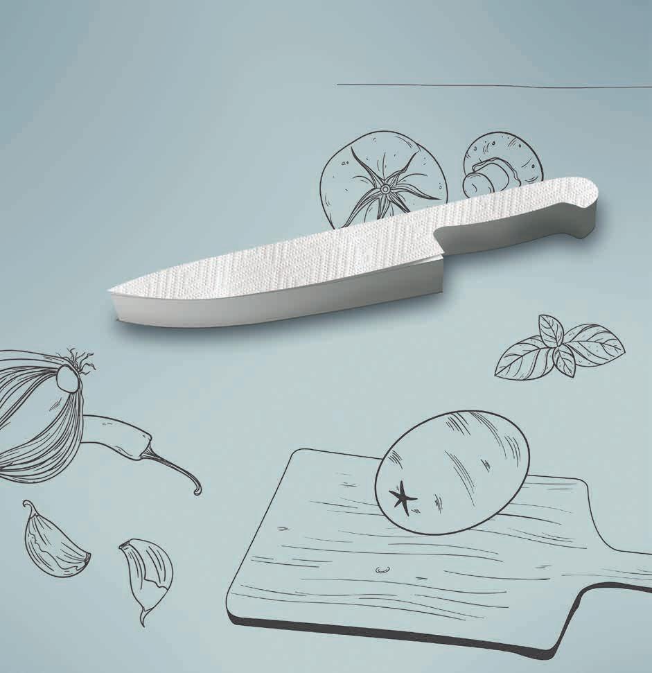 Omnia Labor, proprio come il coltello da cuoco, è lo strumento indispensabile in cucina che assicura assorbenza, resistenza e continuità di servizio, riducendo il consumo eccessivo di carta e l’impatto ambientale.