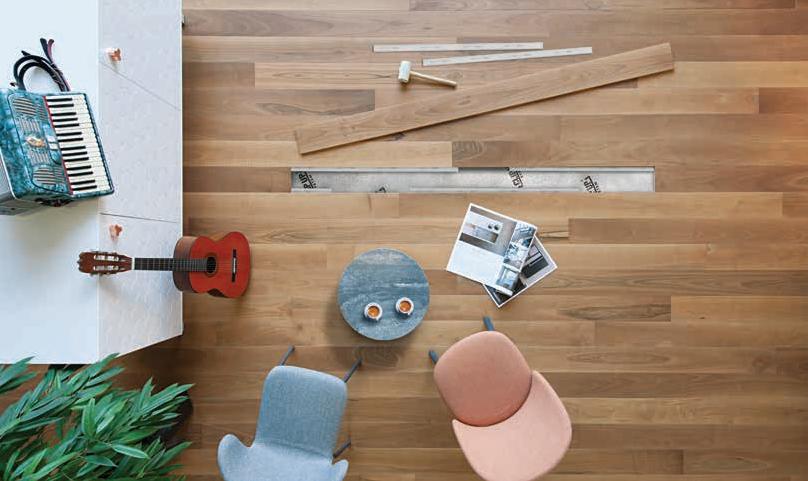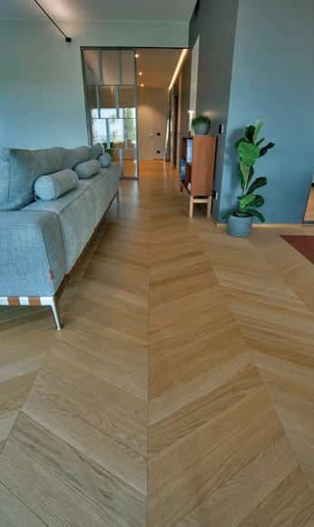 Sono sempre più convinta dell’importanza che assume il pavimento in un ambiente. Negli ultimi anni ho iniziato a definire e a promuovere il parquet come un vero e proprio complemento d’arredo. Il legno infatti o re infinite personalizzazioni e permette di spaziare tra specie legnose e vernici, ma non solo. Un parquet si può installare in tanti modi: geometrie di posa che si sono evolute nel tempo e ancora si stanno evolvendo, tenendo conto del gusto, delle finalità, degli stili di arredo ma anche dei vincoli che troviamo nell’ambiente. Di certo, la posa a correre, che può essere sia a cassero regolare che irregolare, è quella più comunemente installata. Di recente, però, si stanno ria ermando pose dimenticate quali la spina pesce all’italiana e la spina pesce ungherese che Garbelotto propone anche in versione rielaborate con diverse lunghezze, larghezze e angoli di taglio. Inoltre, il suo catalogo propone anche le Quadrotte, disponibili in diverse dimensioni e stili, che su richiesta possono essere arricchite con intarsi in vetro di Murano La Nostra Azienda è andata ben oltre ai soli vincoli estetici: ha ideato Clip Up System®, un sistema di posa innovativo e brevettato che permette l’installazione di un parquet senza l’utilizzo di colla, disponibile in qualsiasi geometria di posa e finitura.