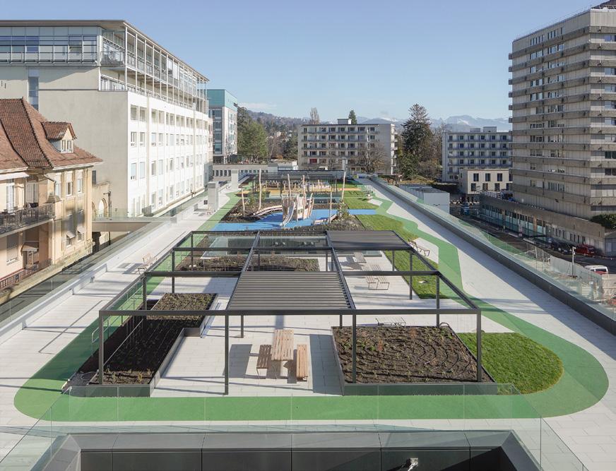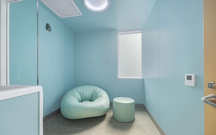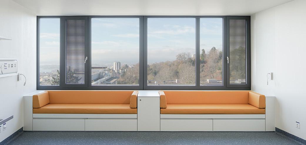 mente interessante è l’integrazione dell’intervento artistico di Camille Scherrer, vincitrice del concorso per l’arte negli spazi pubblici, i cui elementi grafici e figurativi accompagnano l’orientamento e animano gli ambienti. In questo modo, il wayfinding diventa narrazione, e l’arte assume una funzione comunicativa e rassicurante, soprattutto per i bambini. Gli spazi educativi, la scuola in ospedale e le aree dedicate agli adolescenti rafforzano ulteriormente l’idea di un ospedale che sostiene la continuità della vita quotidiana anche nel corso della malattia. I colori verde e blu, utilizzati in facciata, sono ripresi e reinterpretati negli interni in modo più delicato, creando una continuità visiva e simbolica. Queste scelte cromatiche non hanno solo una funzione estetica, ma sono pensate per evocare calma, natura e fiducia, qualità particolarmente importanti in un contesto pediatrico. In generale la luce naturale gioca un ruolo fondamentale nella definizione dello spazio, con ampie aperture che offrono viste sul paesaggio circostante e contribuiscono a creare un ambiente meno medicalizzato. I materiali, insieme ai colori, sono scelti per trasmettere calore e familiarità, evitando l’estetica ospedaliera tradizionale basata su superfici fredde e neutre.
