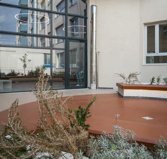 Il giardino terapeutico in copertura è uno degli elementi più innovativi e significativi del progetto, con un’estensione di circa 3.000 m2. Pensato come uno spazio di terapia, riabilitazione e svago, favorisce, grazie alla presenza di vegetazione, percorsi e spazi di sosta, attività