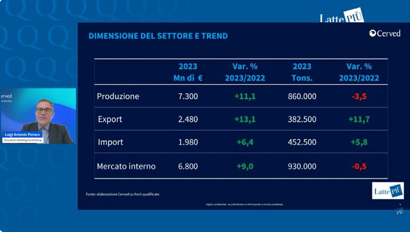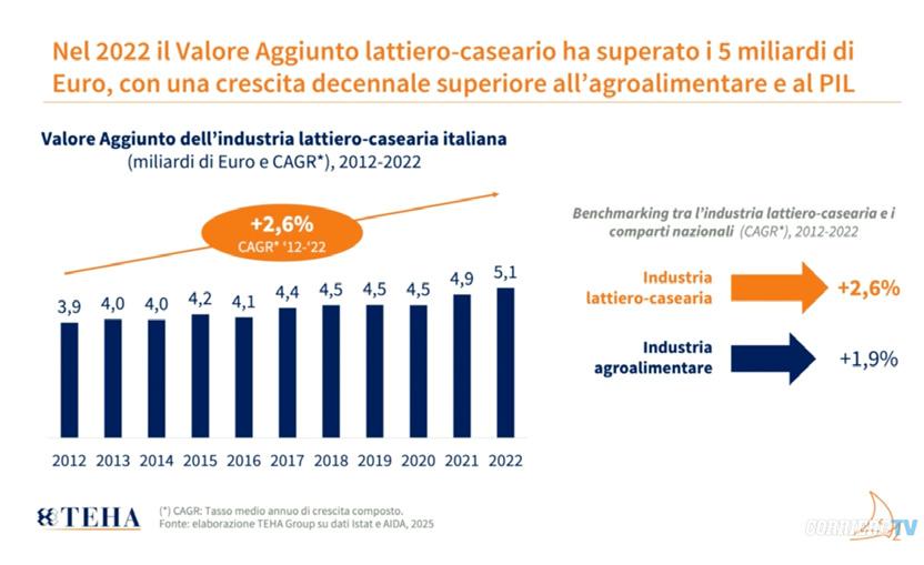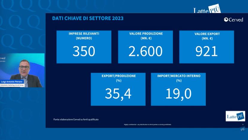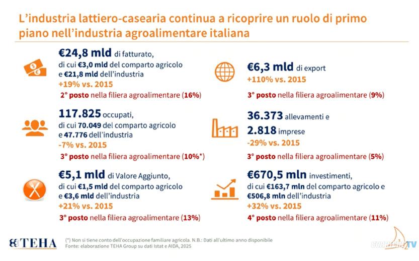 “L’industria lattiero-casearia continua a ricoprire un ruolo di primo piano nell’industria agroalimentare italiana”, ne illustra i risultati Valerio De Molli, Managing Partner e Amministratore Delegato di The European House - Ambrosetti. “I numeri chiave del settore evidenziano tutti un trend di crescita: 25 miliardi di fatturato, di cui 21,8 mld è l’industria in senso stretto; 6,3 miliardi di export posizionandosi al 3° posto della filiera agroalimentare (con il 9% del totale); 5,1 miliardi di valore aggiunto; per concludere questo è un comparto che più di altri investe per la crescita e l’innovazione”.