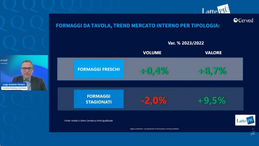 po con una crescita a due cifre anche nel 2023 in termini reali. In calo invece i consumi dei formaggi da tavola stagionati che nel 2023 hanno registrato un ridimensionamento pari al 2% in termini reali, mentre a valore crescono del 9,5%. L’area, rispetto ai formaggi freschi, è penalizzata da un prezzo superiore e della forte concorrenza del Grana Padano utilizzato anche come prodotto da tavola.