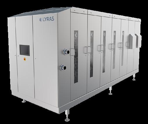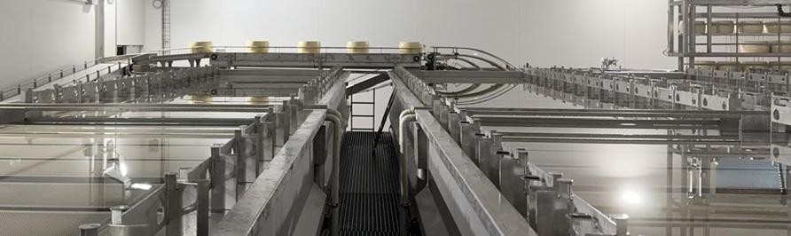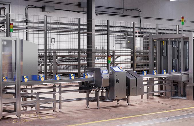 tervento umano, dal trasporto delle forme in salina fino al loro scarico in magazzino di stagionatura. Ogni operazione – movimentazione, immersione, controllo e trasferimento – è governata da un sistema integrato di sensori, coadiuvati da sistemi di visione artificiale, che garantisce precisione e sicurezza costante. Il cuore tecnologico dell’impianto è rappresentato da un innovativo sistema di carico e scarico a dei rack tramite flussi di acqua mutuato dai sistemi di caricamento delle grandi gabbie monolitiche, ma oggi possibile anche nei rack di più piccole dimensioni. Il carroponte automatizzato capace di traslazioni millimetriche assistite da inverter e sensori laser, ultrasuoni e RFID, assicura un posizionamento chirurgico in ogni fase del processo. Il sistema di visione artificiale, integrato nella zona di carico/ scarico, verifica la corretta movimentazio-