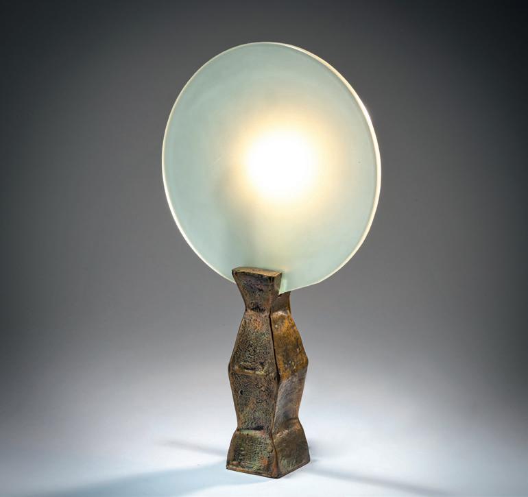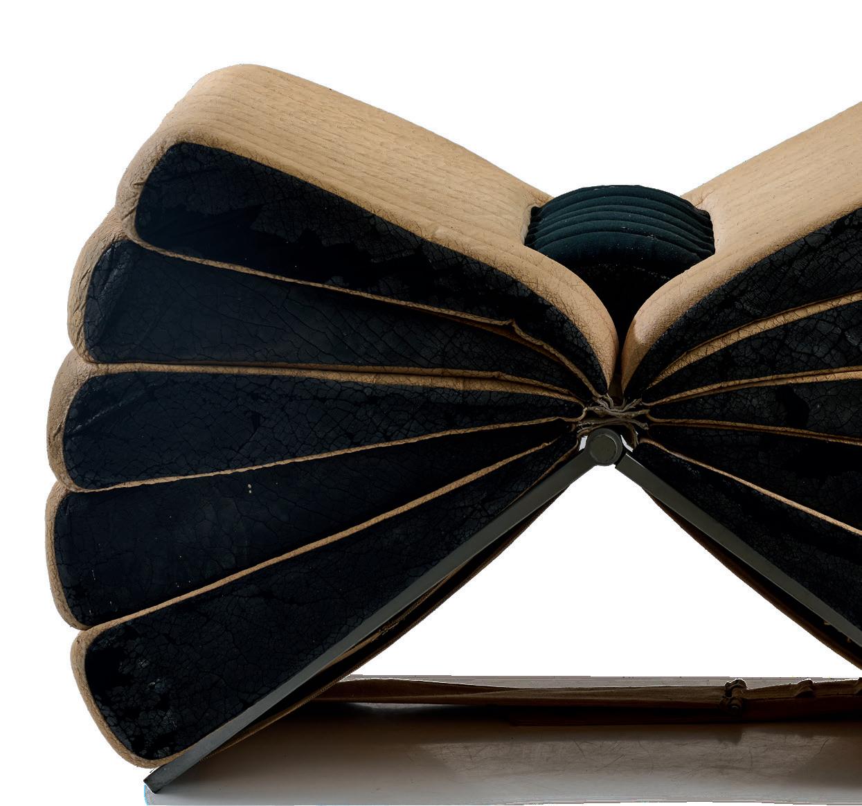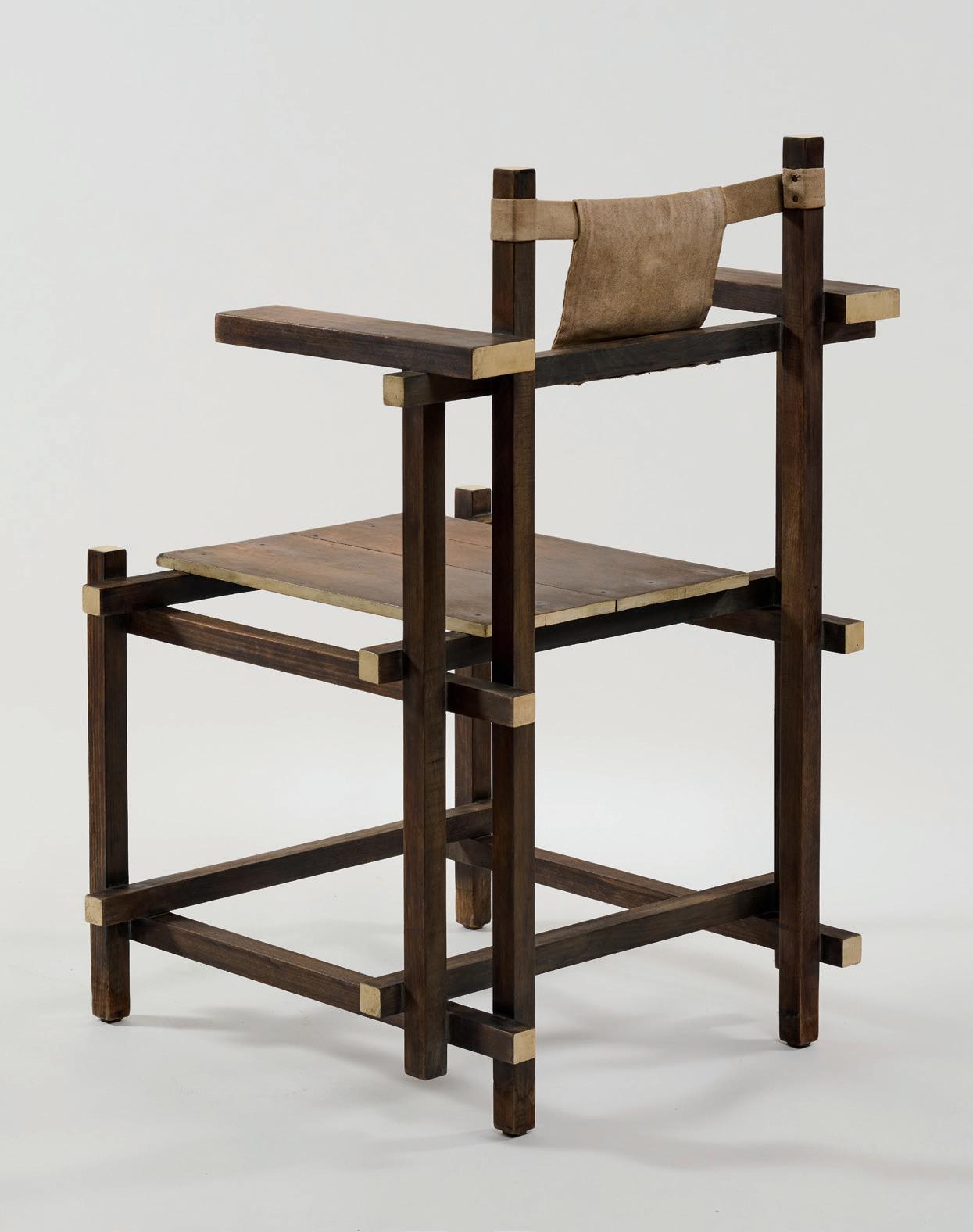 Metal frame, reinforced clay, brown glaze, bron leather.