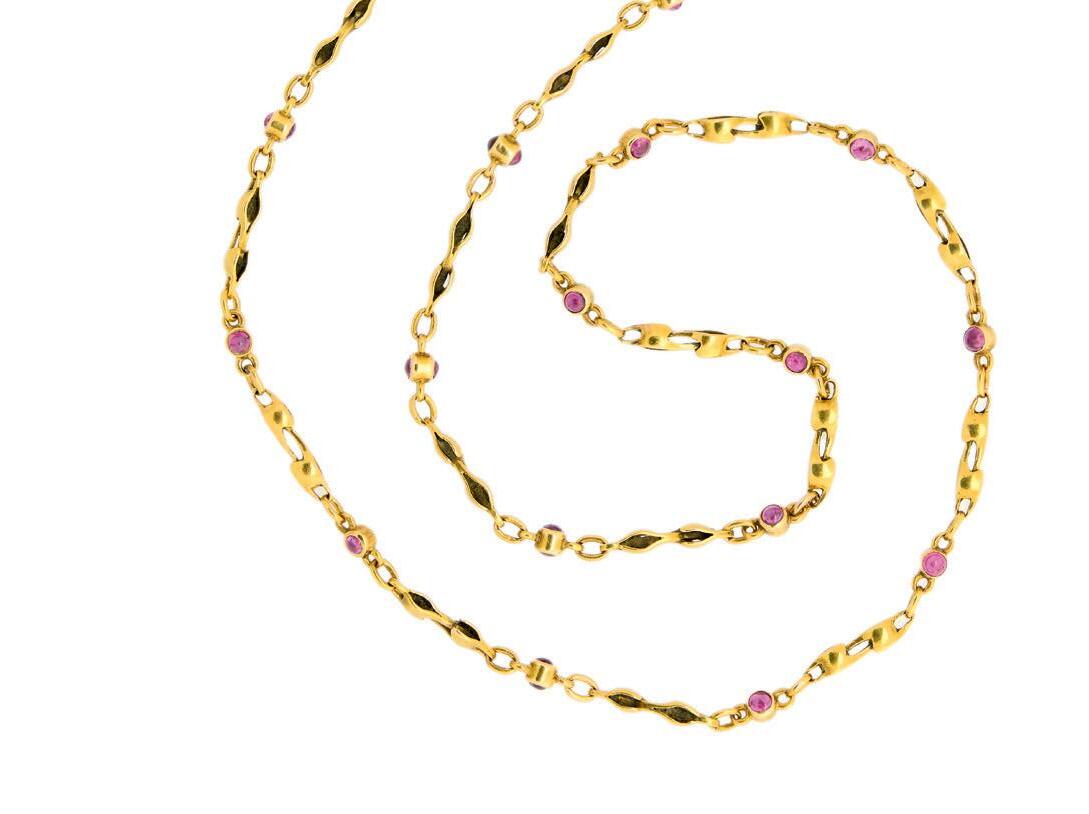 Gold, garnets. 10.24 grams. L. 458 mm. Unmarked.