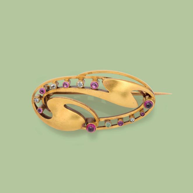 Gold, 8 rubies, 5 diamonds. 8.16 grams. 45 x 19 mm. Stamped: Artist's signet (platelet).