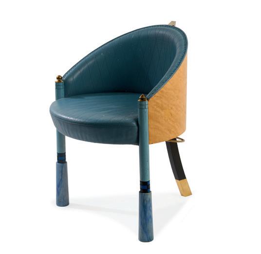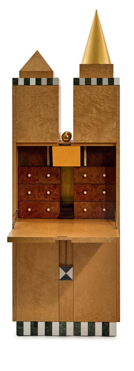 A separate chapter is devoted to the works of Piero Fornasetti, the iconic designer with an unmistakable design signature. Fornasetti's works move masterfully between art and craftsmanship. Whether umbrella stands, wastebaskets, or plates—everyday objects are transformed into stories through Fornasetti's imagery. The 'Leopardo' chest of drawers (cat. no. 336) and the impressive 'Archittetura' secretary cabinet (cat. no. 339) add special accents. The prototype of this model was created in 1951 in collaboration between Piero Fornasetti, Gio Ponti, and Fratelli Radice. The version offered here has an estimate of € 20,000.