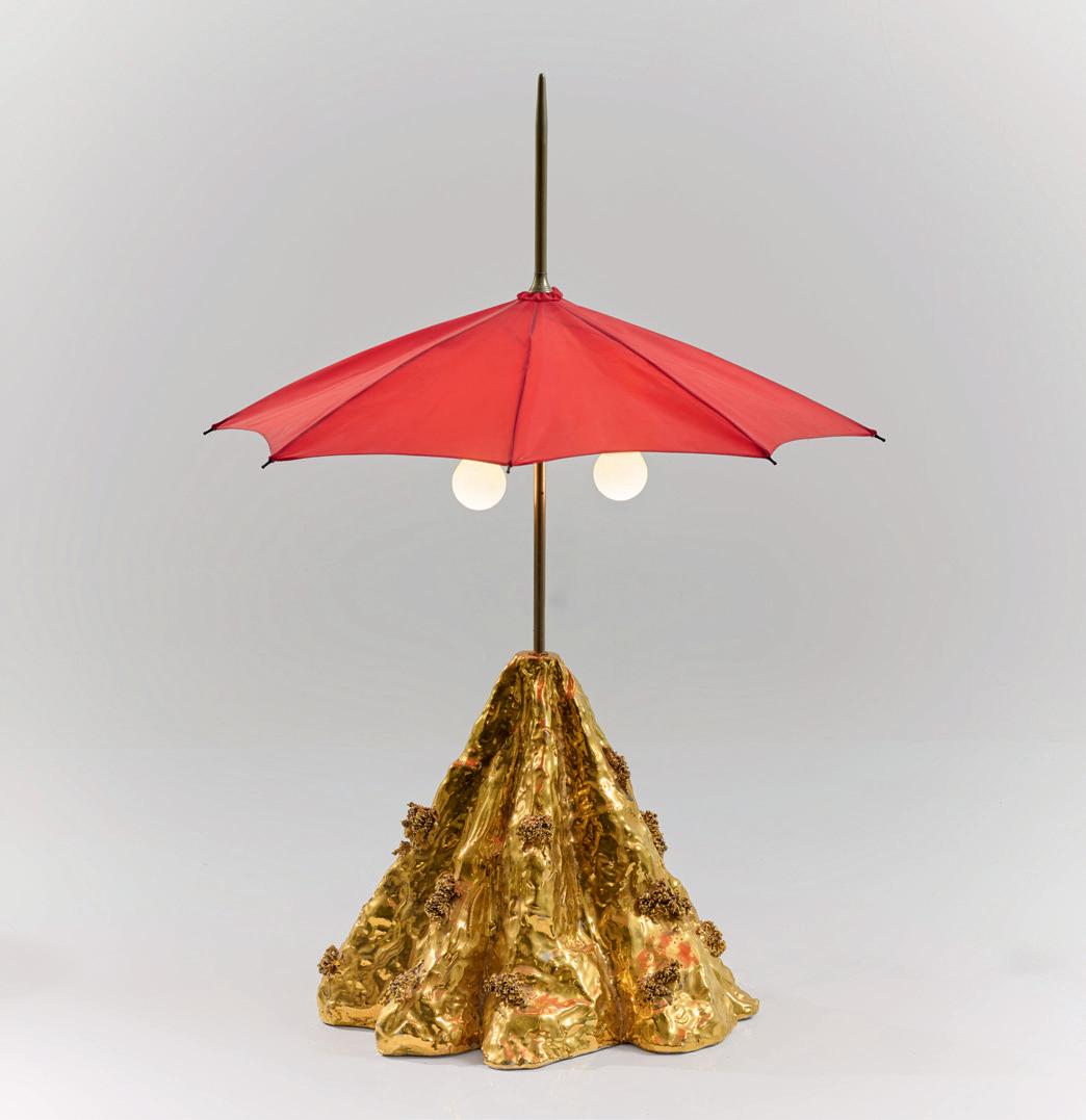 Faience, gold glazed, umbrella with red fabric cover.