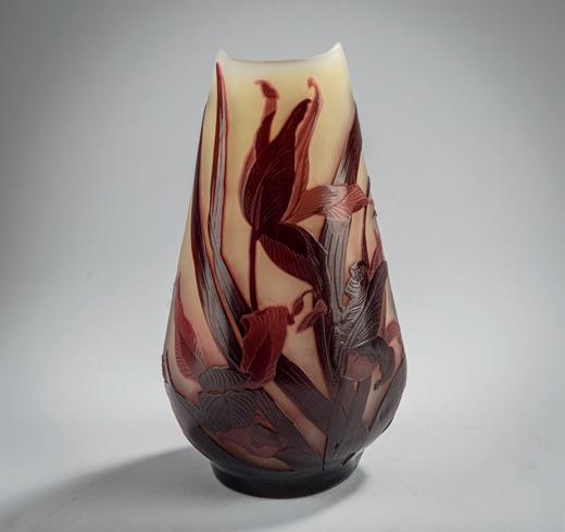 H. 34.6 cm. Cased glass, colorless, hon ey-yellow and pink powder inclusions, streaked, matted. Etched and red enameled decor with fuchsias on a rough background, heightened with gold. Signed: Daum, Cross of Lorraine, Nancy (needle etching). € 2.200 - 2.800