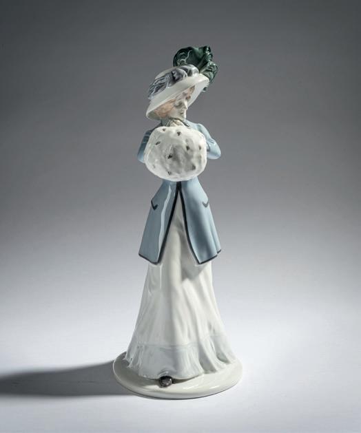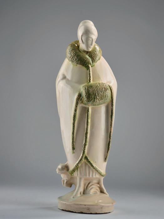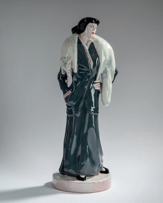 Lady in a winter costume with a dog, c. 1925 H. 47 cm. Majolica, white and green glazed. Marked: BW in a triangle (embossed). € 600 - 800