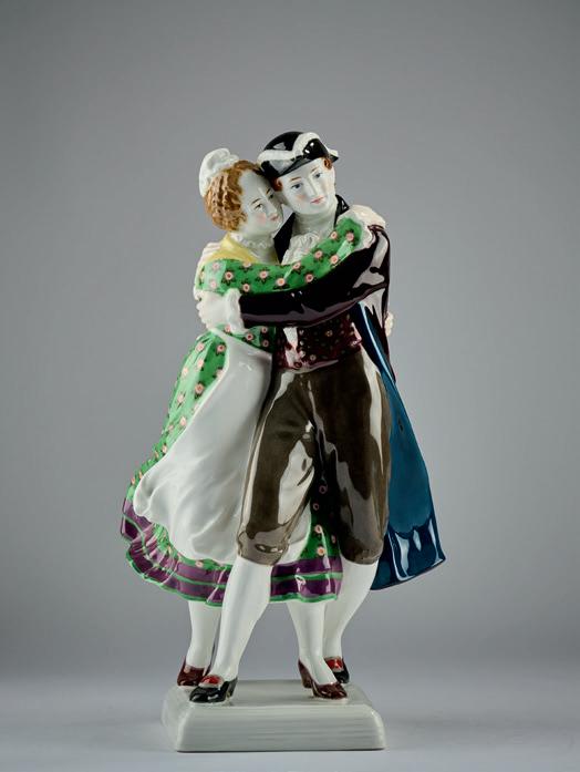 Georg Grasegger 'Maid and Servant', 1914 H. 34.5 cm. Executed by KPM Berlin, 191418. Porcelain, white, glazed, polychrome underglaze. Base signed: GRASEGGER 1914 (embossed). Marked: scepter (blue, under glaze), orb (red, under glaze), World War II mark (black, overglaze), 10476, Pi ( ) (embossed), 140/883, additional mark (gray, handwritten).