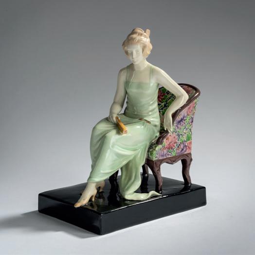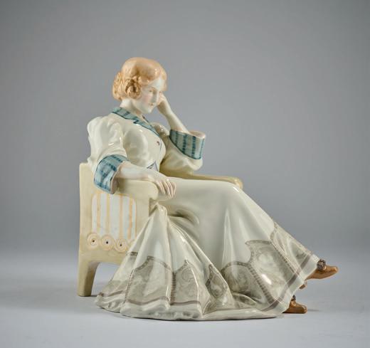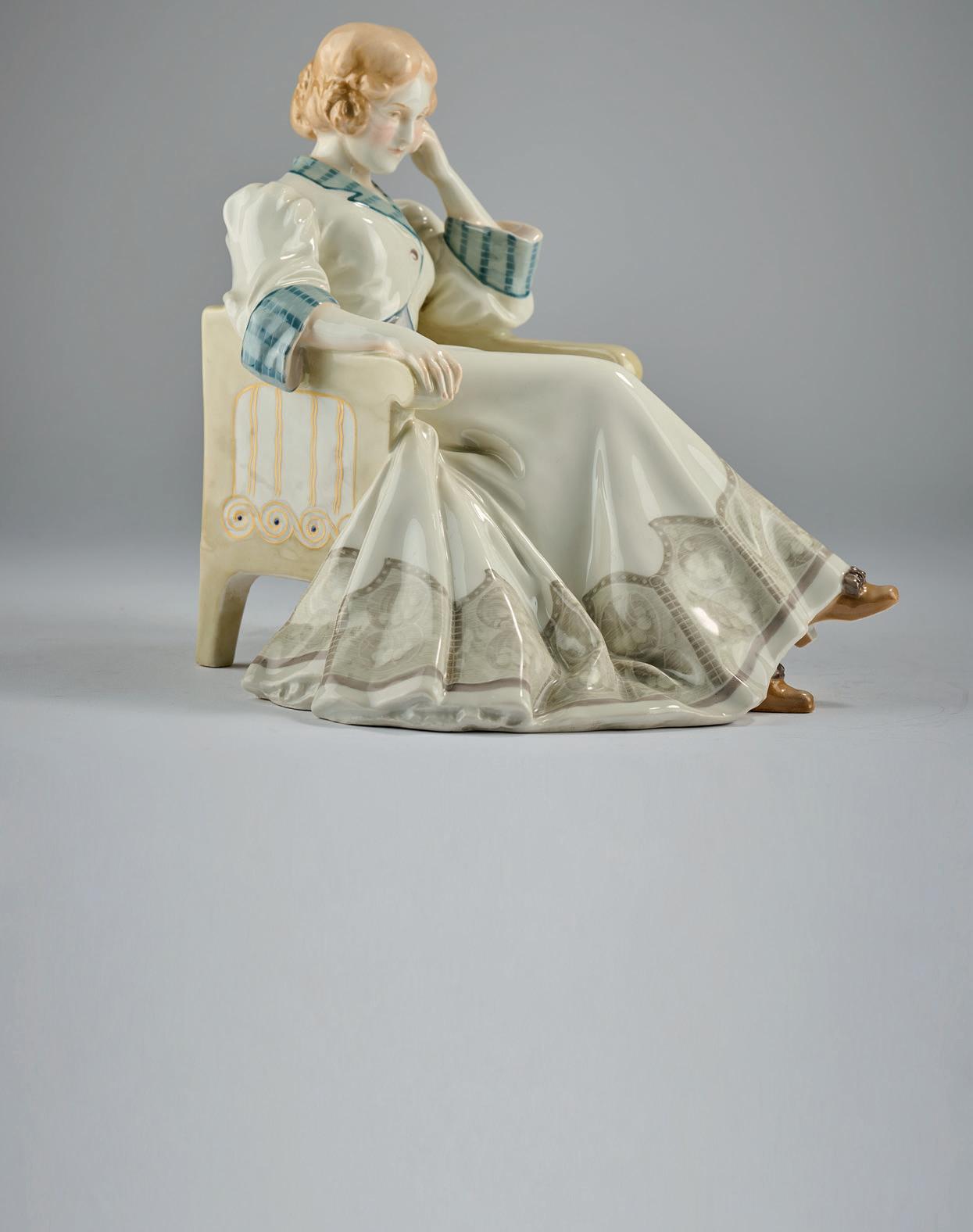 Carl Reschke Seated lady in crinoline, 1909 H. 23 cm. Executed by KPM Berlin, 1913. Porcelain, white, glazed, underglaze, predominantly yellow. Couch signed: RESCHKE (em bossed). Marked on the bottom: scepter, orb (blue, under glaze), M15, Scherben, 9330, date letter N, additional sign(embossed), 140/564, B (violet, handwritten).