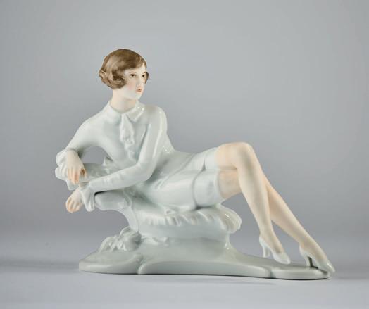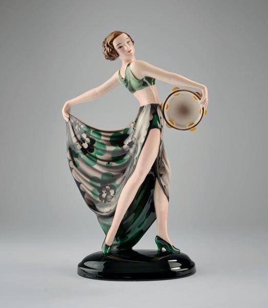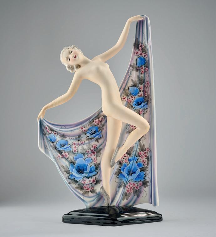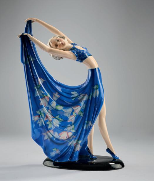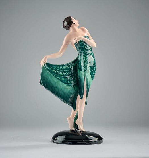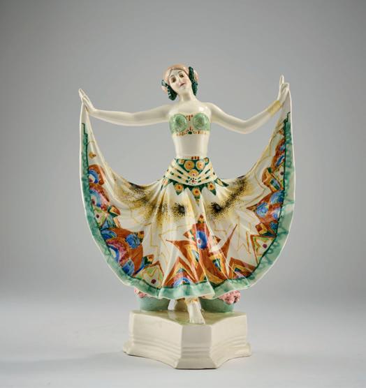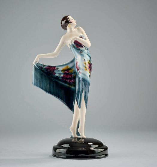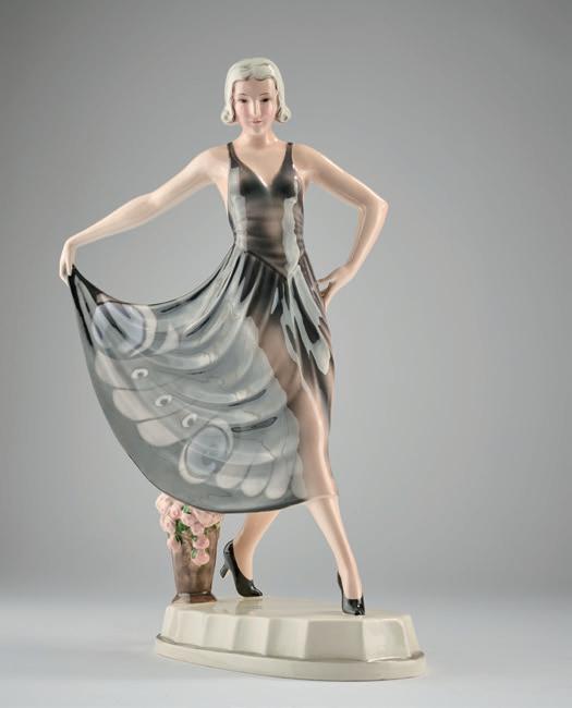 Lilian Harvey dancing. H. 40 cm. Execution: Friedrich Goldschei der, Vienna. Earthenware, polychrome glaze. Base (falsely) signed: Lorenzl (embossed). Bottom: MADE IN AUSTRIA HAND-DECO