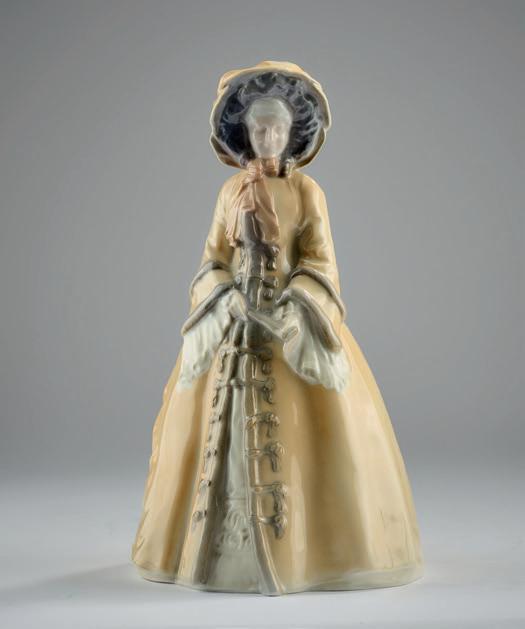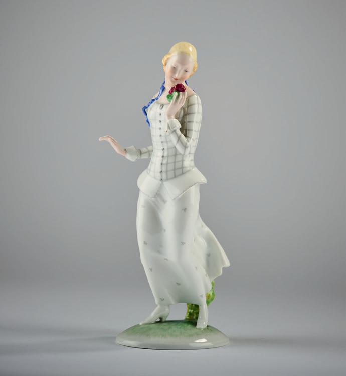 H. 34.5 cm. Executed by KPM Berlin, 1913. Porcelain, white, glazed, polychrome un derglaze. Skirt hem signed on the bottom: H. HUBATSCH 09 (embossed), scepter, orb, anniversary mark 1763-1913 (blue, under glaze), M 15, H (embossed), 9362 (incised), 140/380 (black, handwritten).