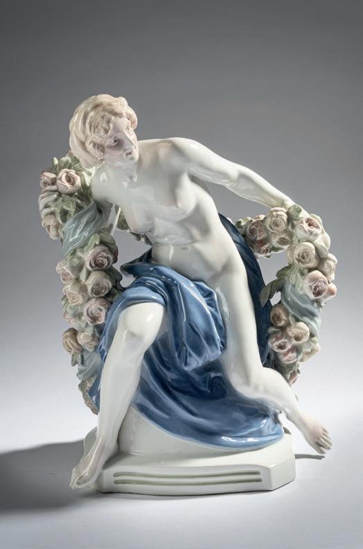 Paul Schley 'Flora' - 'Seated Figure, Female, with Garland of Flowers', 1909 H. 34 cm. Execution: KPM Berlin, 1911. Porcelain, white, glazed, polychrome underglaze. Base signed: PSchley, 10 (embossed). Marked: scepter (blue, under glaze), 9182 (incised), shape symbol, date letter L (embossed).