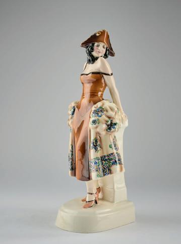 H. 35 cm. Execution: Friedrich Goldscheider, Vienna. Earthenware, polychrome glaze. Skirt hem signed: Lorenzl (embossed). Bottom: Goldscheider Vienna, MADE IN AUSTRIA HAND-DECORATED (black glaze stamp), 5589 (!) 9 3 7 (embossed), L 1278 (incised), painter's signet (black, handwritten).