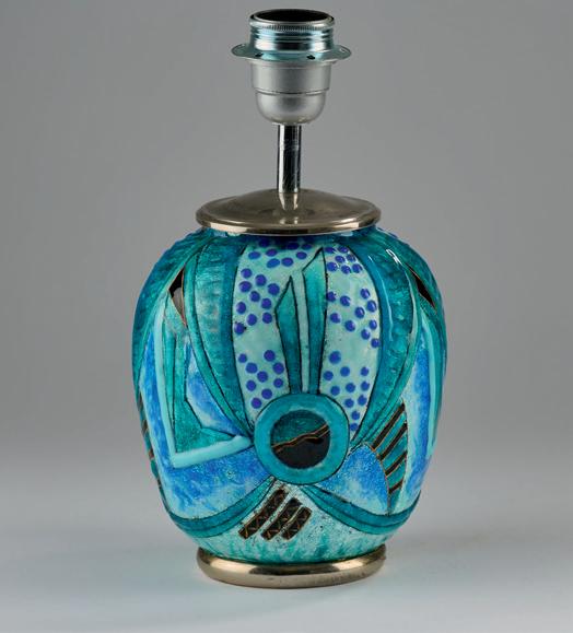 Gamet, Paris Lamp base, 1930s H. 28.5 cm. Copper sheet covered with precious metal foil, polychrome, partially impasto enamel. Signed: GAMET PARIS (black, handwritten). Nickel-plated base and mounting. € 400 - 600