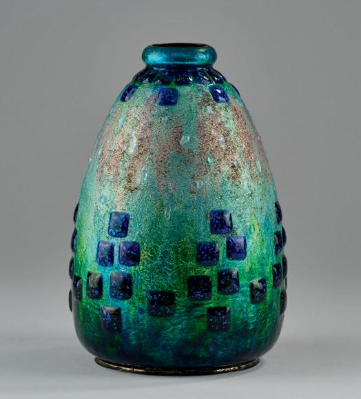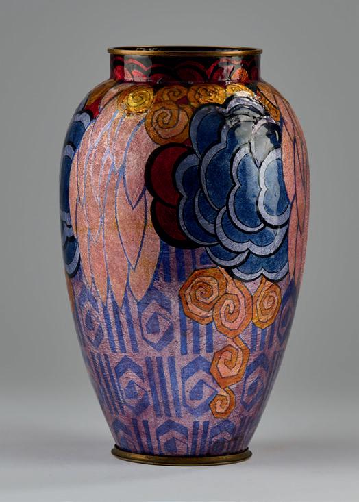 H. 29.2 cm. Sheet copper covered with precious metal foil, polychrome impasto enamel. Signed inside: C. FAURÉ LIMOGES (gold, handwritten). Brass base. € 600 - 800