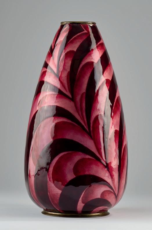 Sarlandie Tall vase, c. 1936 H. 34.5 cm. Copper sheet covered with precious metal foil, enameled in shades of violet and colorless. Signed: SAR LAN DIE A LIMOGES DECOR DE T. DROIT (black, handwritten). Ring loose. € 500 - 700