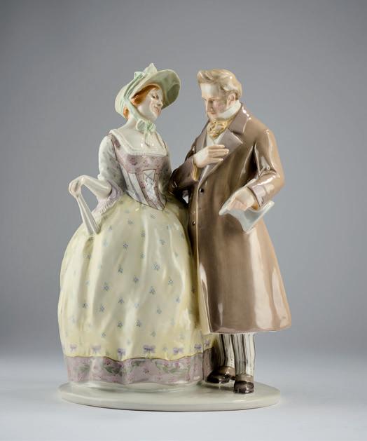 'Group of figures from the time of Friedrich Wilhelm IV', 1905 H. 23 cm. Executed by KPM Berlin, 1908. Porcelain, white, glazed, polychrome overglaze with gold. Base signed: A. Reichel fec. (em bossed). Marked on the bottom: scepter (blue, under glaze), orb (red, on glaze), 7930, date letter H, A (embossed), 140/133 (black, handwritten).