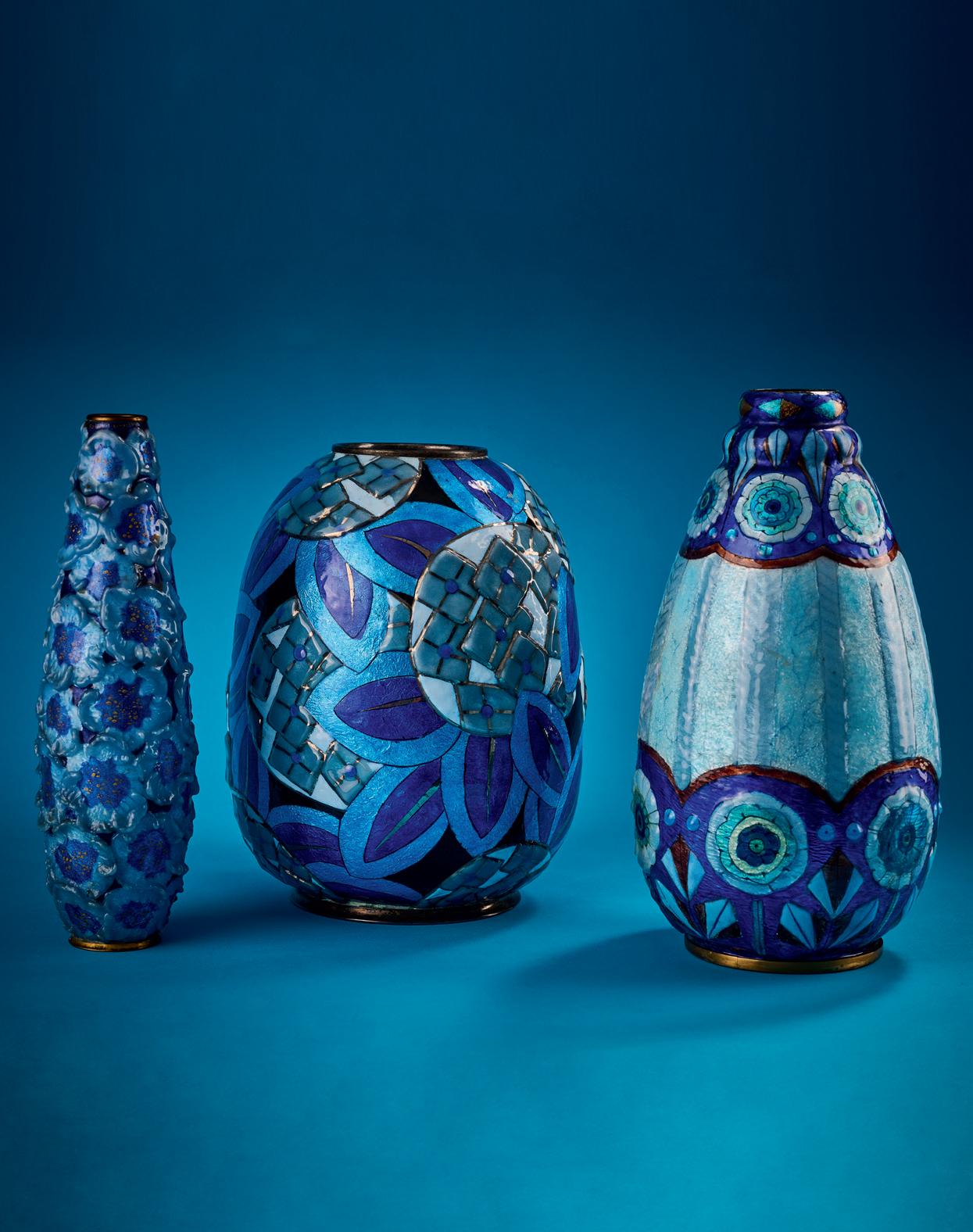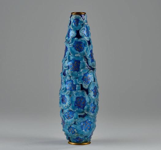 H. 25.8 cm. Copper sheet covered with precious metal foil, impasto enameling in shades of blue with gold spots. Signed: JSarlandie, Limoges (gold, handwritten). Brass rim and base. Original sales label Lyon on the bottom.