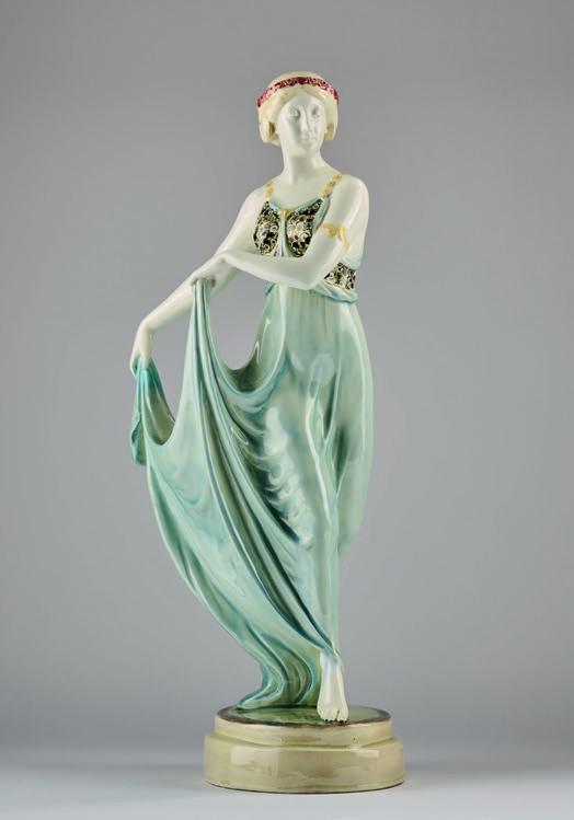 H. 35.5 cm. Execution: Friedrich Goldscheider, Vienna. Earthenware, polychrome glaze. Base with original manufacturer's label for the company's 50th anniversary. Marked on the bottom: Goldscheider Wien, MADE IN AUSTRIA, Dakon (black glaze stamp), 7195, 108 11 (em bossed), two handwritten signets, remains of an original paper label. Dechant/Goldscheider, Goldscheider, Stuttgart 2007, p.451, no. 7195. € 700 - 900