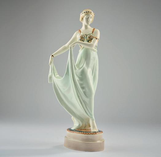 'In the Wind', 1913 H. 28 cm. Execution: Rosenthal, Selb, c. 1914. Porcelain, white, glazed, polychrome underglaze. Base signed: RUDOLF MAR CUSE (brown). Marked on the bottom: manufacturer's mark (green, under glaze), K 293 (embossed), M (green, handwrit ten). Struss, Rosenthal, Augsburg 1995, p. 54.