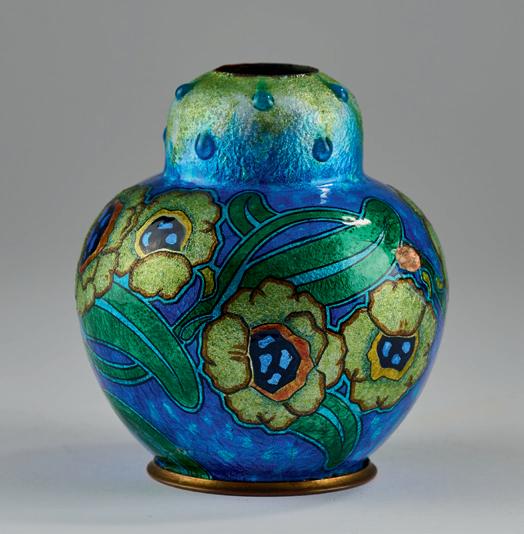 Small gourd vase, before 1956 H. 12.8 cm. Sheet copper covered with precious metal foil, polychrome enamel with floral decoration. Signed: C. FAURE LIMO GES (gold, handwritten). Copper foot. Chipped. € 400 - 600