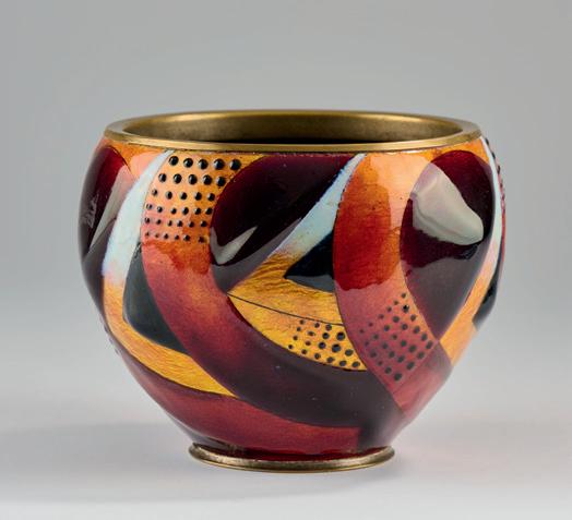 H. 13 cm, Ø 16.5 cm. Sheet copper covered with precious metal foil, polychrome enamel. Brass rim and base. Signed: JSarlandie Limoges (black, handwritten).