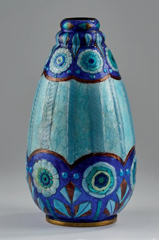 H. 15.5 cm. Copper sheet covered with precious metal foil, polychrome enamel with tendrils of flowers. Signed: A. MARTY LIMOGES (gold, handwritten). Brass rim and base.