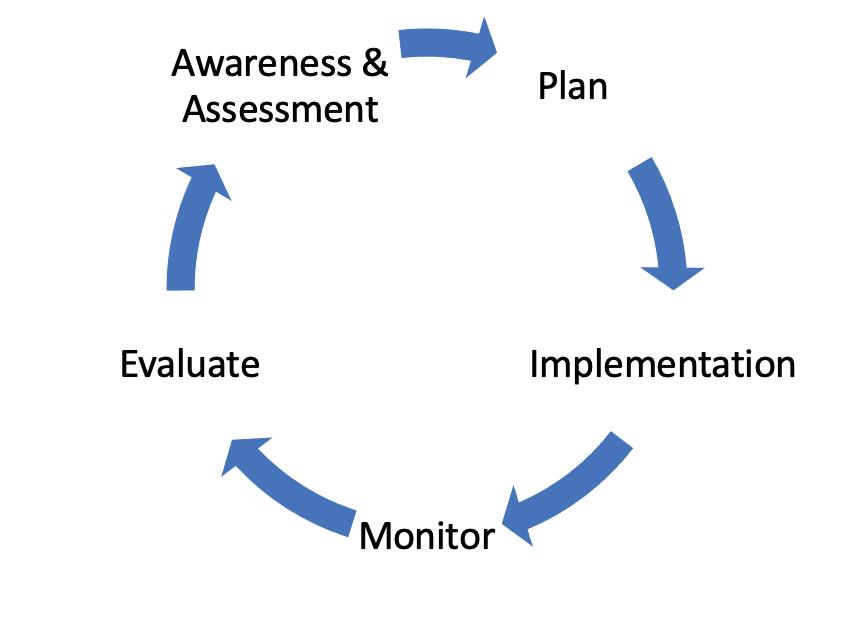 An iterative cycle of planning informed by current awareness and assessment, implementation per the informed plan, monitoring the results of the implementation and then evaluating the trends in the monitoring data, which could lead to adjustments in the plan .