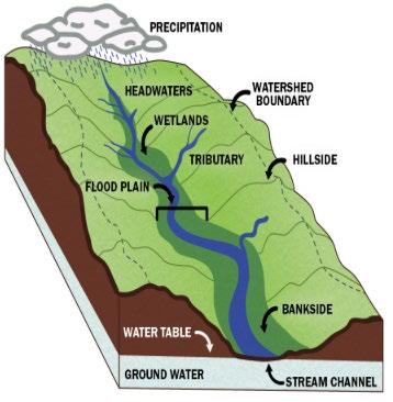 A watershed is an area of land where all the water from rain or snowmelt drains into a common body of water, such as a river, lake, or ocean. Water from precipitation travels in a watershed on the surface or underground, shaping the landscape as it flows and providing a water supply to support the entire area. Watershed encompasses everything within its geographic boundary—soil, terrain, water, air, plants, animals, and people— as an interconnected ecosystem.They play a vital role in distributing water across the landscape, filtering and storing it, and buffering against environmental challenges like fire, floods, and droughts.