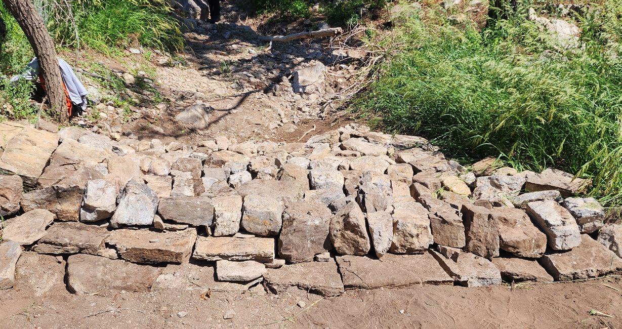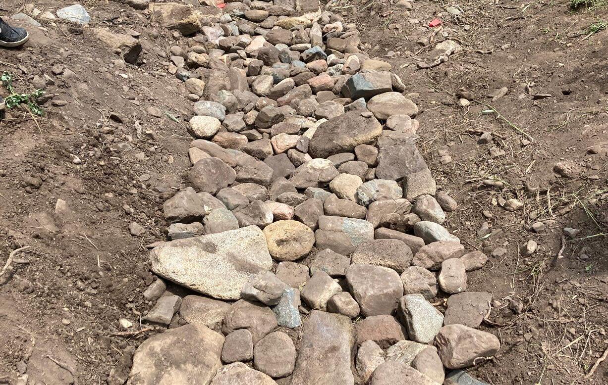Rocks used in a media luna should be heavy and stable enough to resist displacement by water. They should be built on relatively flat ground to minimize the risk of further erosion. Both tips of the structure should be at the same elevation to ensure even water distribution and prevent from bypassing the structure. Uneven tips can