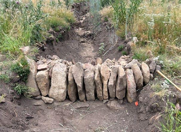 supported by the rocks below it. Interlocking rocks together distributes the weight evenly and prevents slippage. An uneven lip can cause water to bypass the structure, leading to new erosion and reducing the effectiveness of the Zuni bowl.