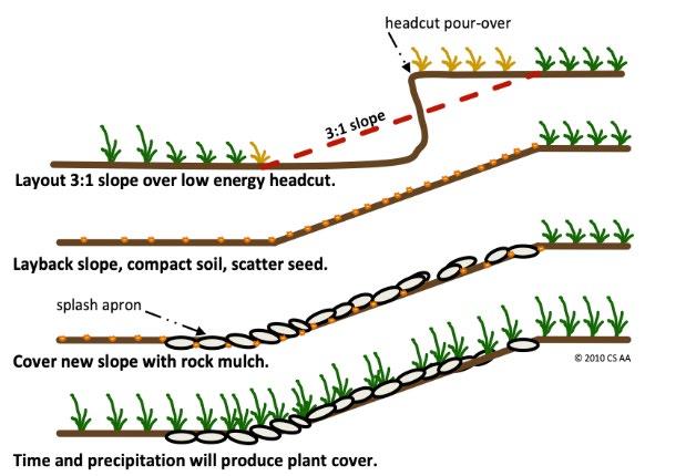 Start by selecting an appropriate headcut to address. Shape and lay back the face and lip of the headcut to create a stable surface with sufficient space to accommodate the rocks used in construction of the structure. Level the base by removing loose material.