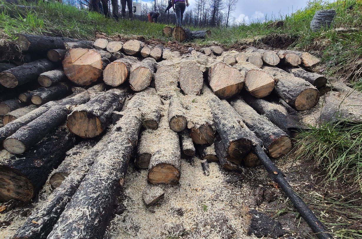 The logs act as barriers that slow water movement, trap sediment, and reduce surface runoff. Over time, contour felling promotes water infiltration, stabilizes loose soils, and creates a medium for vegetative growth. Contour-felled logs can be incorporated with other restoration methods such as worm ditches (conveyance swales), discussed in the following pages.