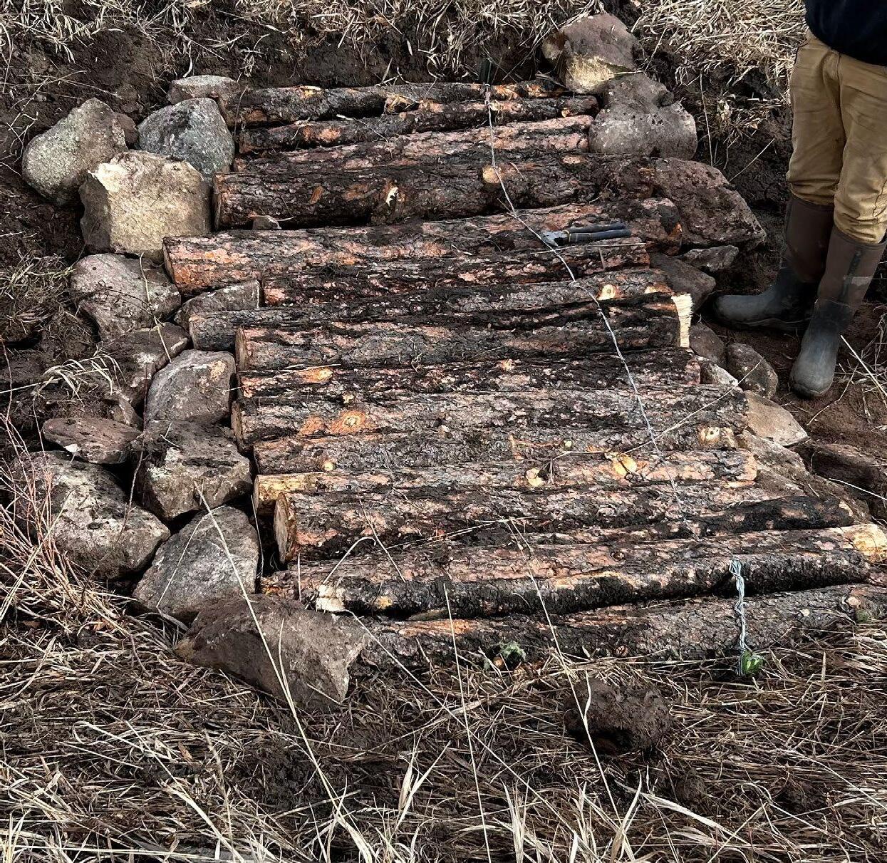 Make a ramp with the logs on the upstream side by arranging the cut logs next to each other with one end on the bed and the other resting on the crossbeam at an approximately 30 degree angle from the channel bed. Irregularities and branches that do not interfere with the placement can be left on some logs to help to entrain more debris and sediment. Rotate them as needed to minimize gaps between the logs at the bottom.