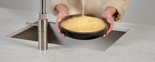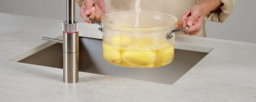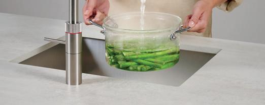 En plus de l’eau bouillante à 100 °C, un Quooker avec réservoir COMBI peut aussi fournir de l’eau chaude instantanément, en mélangeant de l’eau froide à l’eau bouillante du réservoir et ainsi éviter tout gaspillage d’eau.
