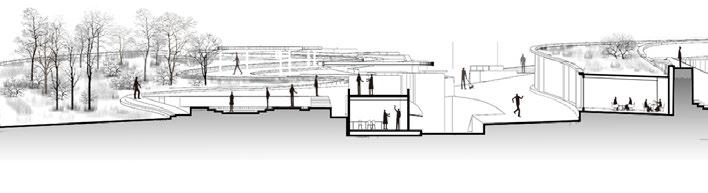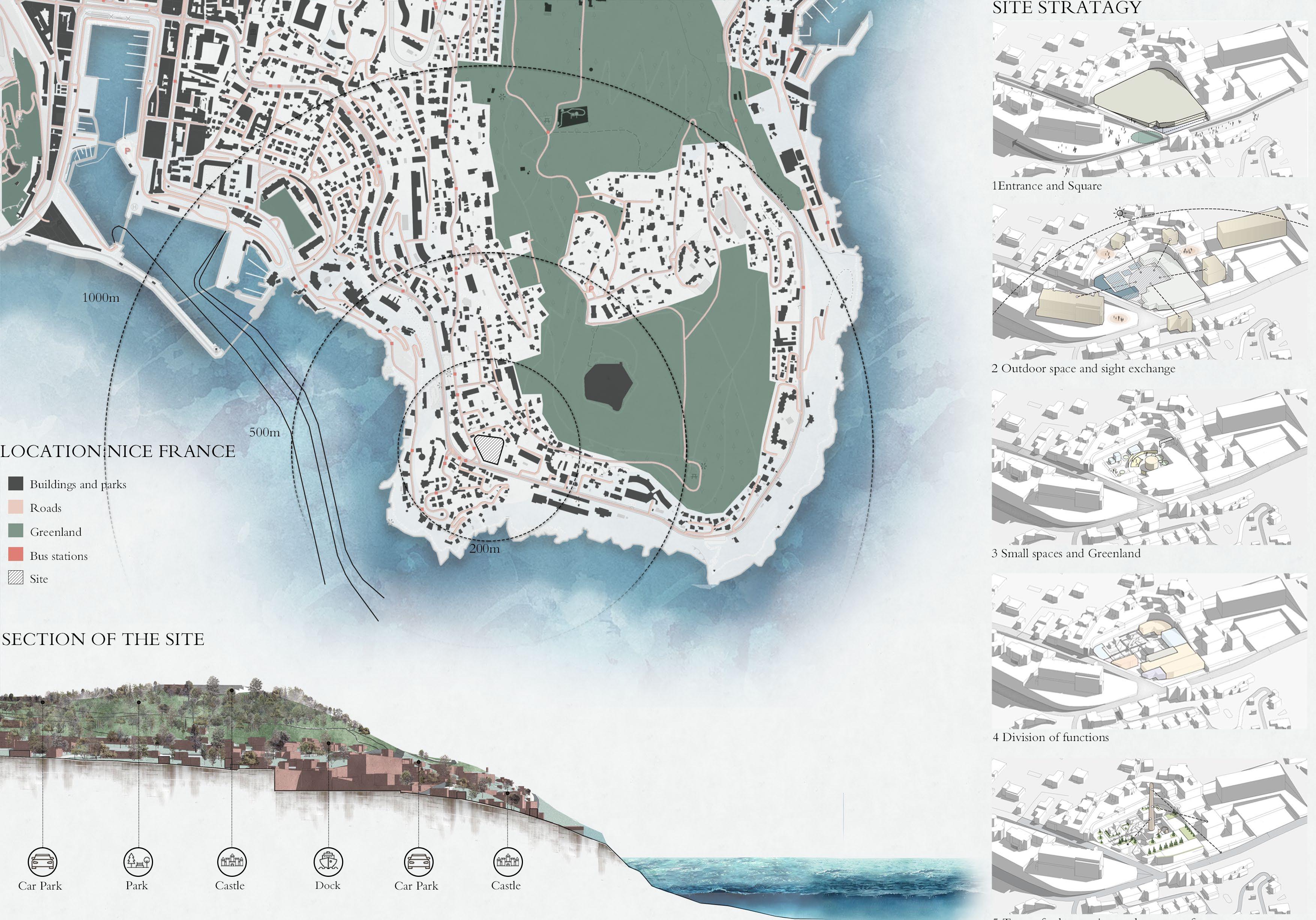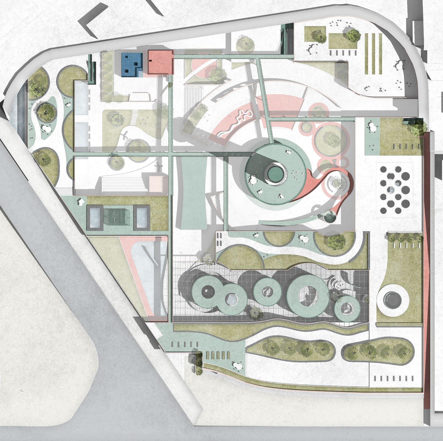 The sections of the site shows its various spatial characteristics. On various high and low platforms, people can carry out various activities, and the whole site also has rich opportunities for visual communication. From the innovation center to the architectural community, to the theater, students can choose any activity they want to carry out.
